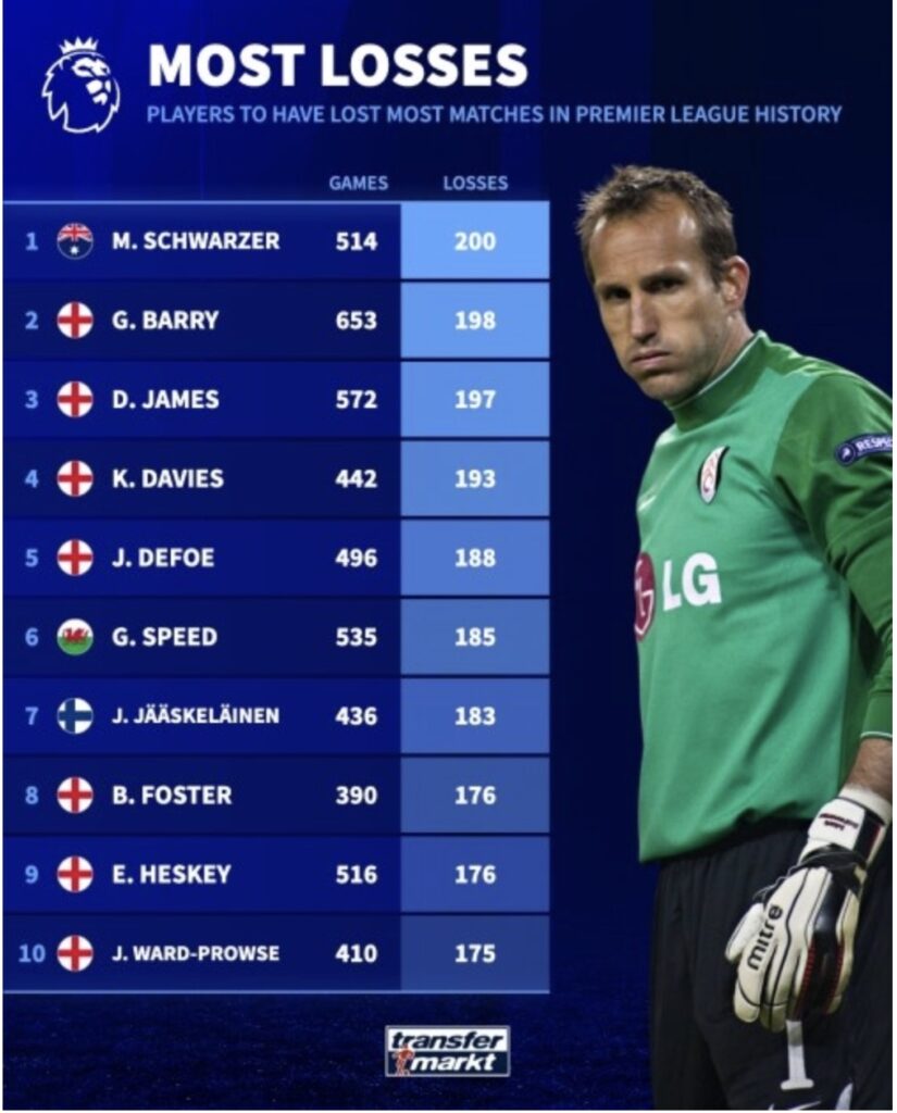 Transfermarkt đã tổng hợp số liệu thống kê về số lần thua của các cầu thủ tại Ngoại hạng Anh và lập danh sách xếp hạng số lần thua nhiều nhất mọi thời đại tại giải đấu này. Mark Schwarzer có số trận thua nhiều nhất với 200 trận, tiếp theo là Gareth Barry với 198 trận.